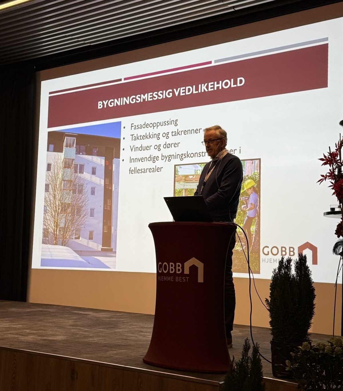 Etter Bjørn overtok Sindre A. Engum og Nina K. Ødegaard fra GOBBs tekniske avdeling. De viste eksempler på planlagt vedlikehold, illustrert med konkrete vedlikeholdsprosjekter, og demonstrerte hvordan GOBBs digitale vedlikeholdsplan (VLP) kan brukes i praksis for å gi styret full kontroll og trygghet. Med dette verktøyet får styret et digitalt hjelpemiddel som gjør det enklere å planlegge, prioritere og følge opp tiltak. Som Bjørn så presist uttrykte det: «Forebygging er alltid billigere enn reparasjon.»